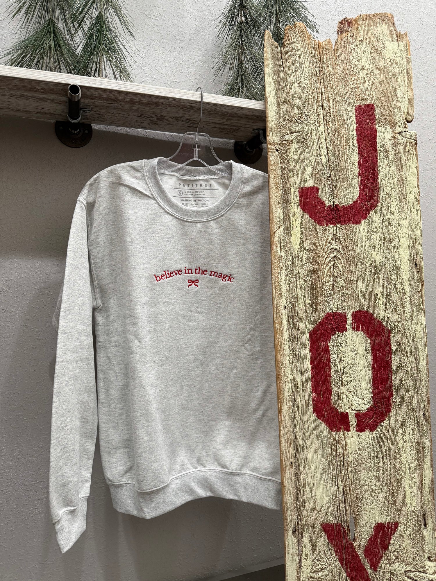 This red “Believe in the Magic” embroidered sweatshirt adds the perfect coquette touch to your holiday wardrobe. Featuring varsity-style lettering and a soft, cozy feel, it’s the ideal festive crewneck for winter outings, holiday photos, gifting, or everyday seasonal wear. Cute, comfy, and perfectly on-trend for Christmas.